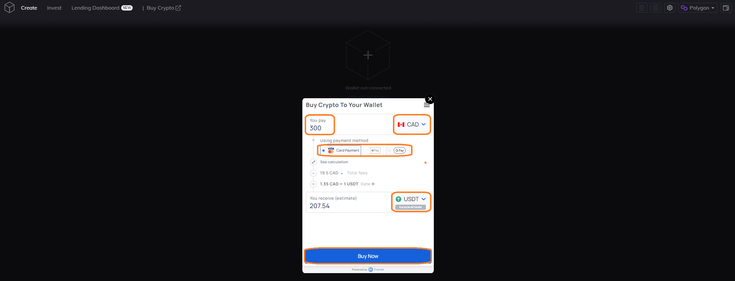 <figure><img src="https://3397064156-files.gitbook.io/~/files/v0/b/gitbook-x-prod.appspot.com/o/spaces%2F-MJ0u2YbMrrM5MnNGC9b-840747077%2Fuploads%2FsPnxl2gcl3MBteNkPnyL%2Ftransak%203.png?alt=media&#x26;token=52c3bea4-cb92-4897-877e-d9c272bc5af9" alt=""><figcaption></figcaption></figure>