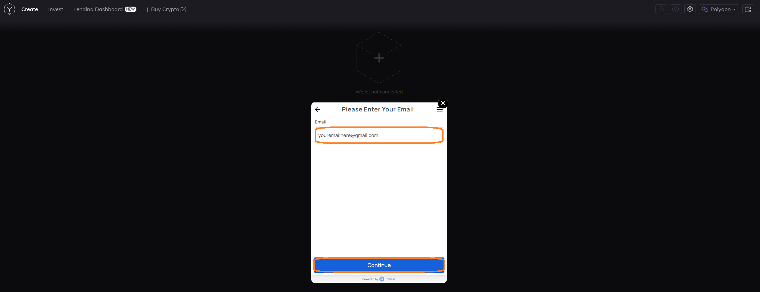 <figure><img src="https://3397064156-files.gitbook.io/~/files/v0/b/gitbook-x-prod.appspot.com/o/spaces%2F-MJ0u2YbMrrM5MnNGC9b-840747077%2Fuploads%2FWu08SfWiZfEHfsmeZmt7%2Ftransak%206.png?alt=media&#x26;token=8db306bf-9308-46bc-b3c5-82ef884fd565" alt=""><figcaption></figcaption></figure>