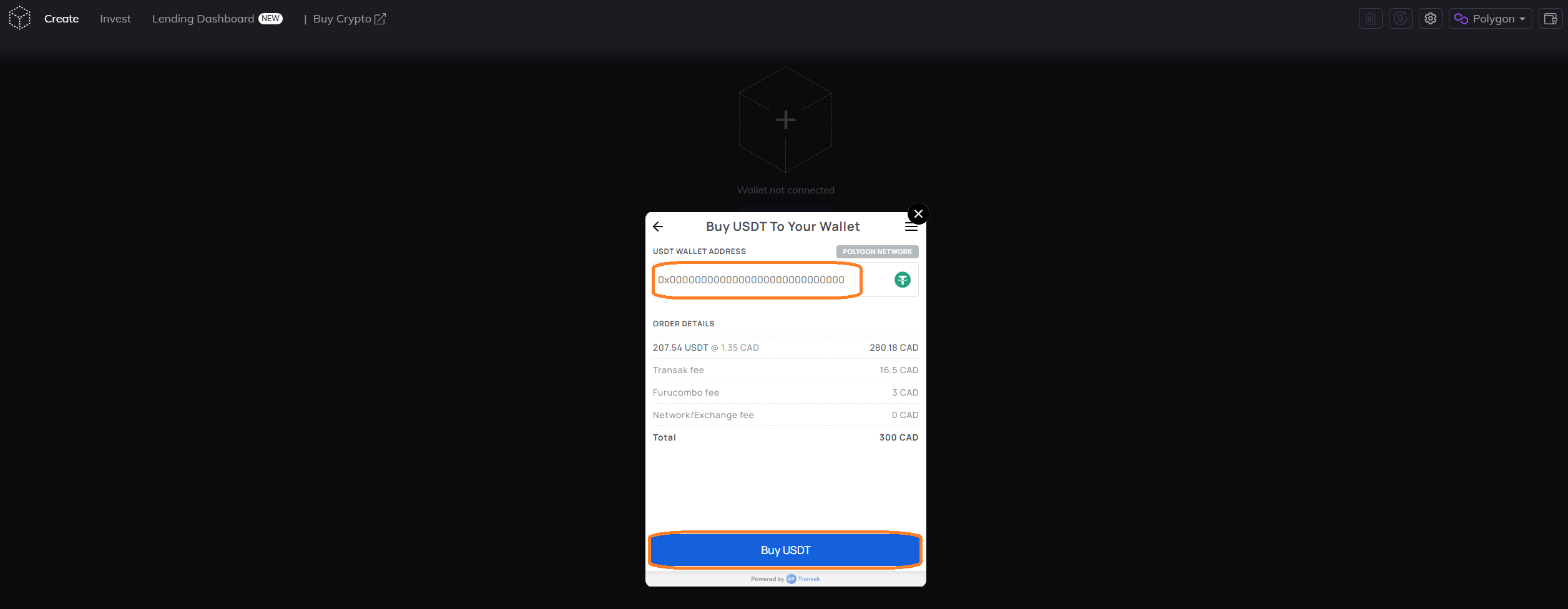 <figure><img src="https://3397064156-files.gitbook.io/~/files/v0/b/gitbook-x-prod.appspot.com/o/spaces%2F-MJ0u2YbMrrM5MnNGC9b-840747077%2Fuploads%2FhekqfBh1NI9XQrOoe8Jy%2Ftransak%204.png?alt=media&#x26;token=69b818dd-9c8c-4831-86cc-ace70aa63fa8" alt=""><figcaption></figcaption></figure>